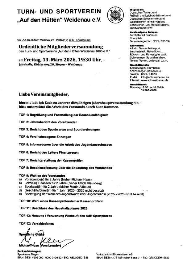 - 13.03.2026 um 19:30 Uhr in der Vereinsturnhalle: Jahreshauptversammlung